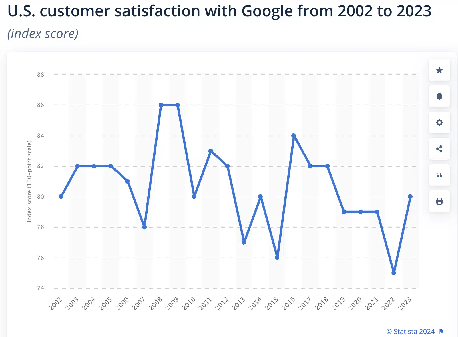 In 2008-2009, Google’s satisfaction score maintained a historical high of 86 points. However, since 2016, the score gradually declined, hitting a low of 75 points in 2022. But after that, the score quickly rebounded, rising to 80 points in 2023 and further increasing to 81 points in 2024.